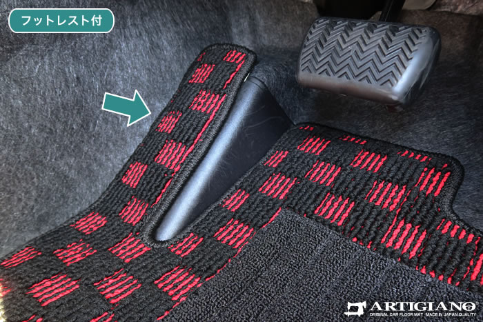 ヤリスにフットレスト付きの運転席マットを装着(R1000生地チェック赤黒×ロック糸・ブラック)